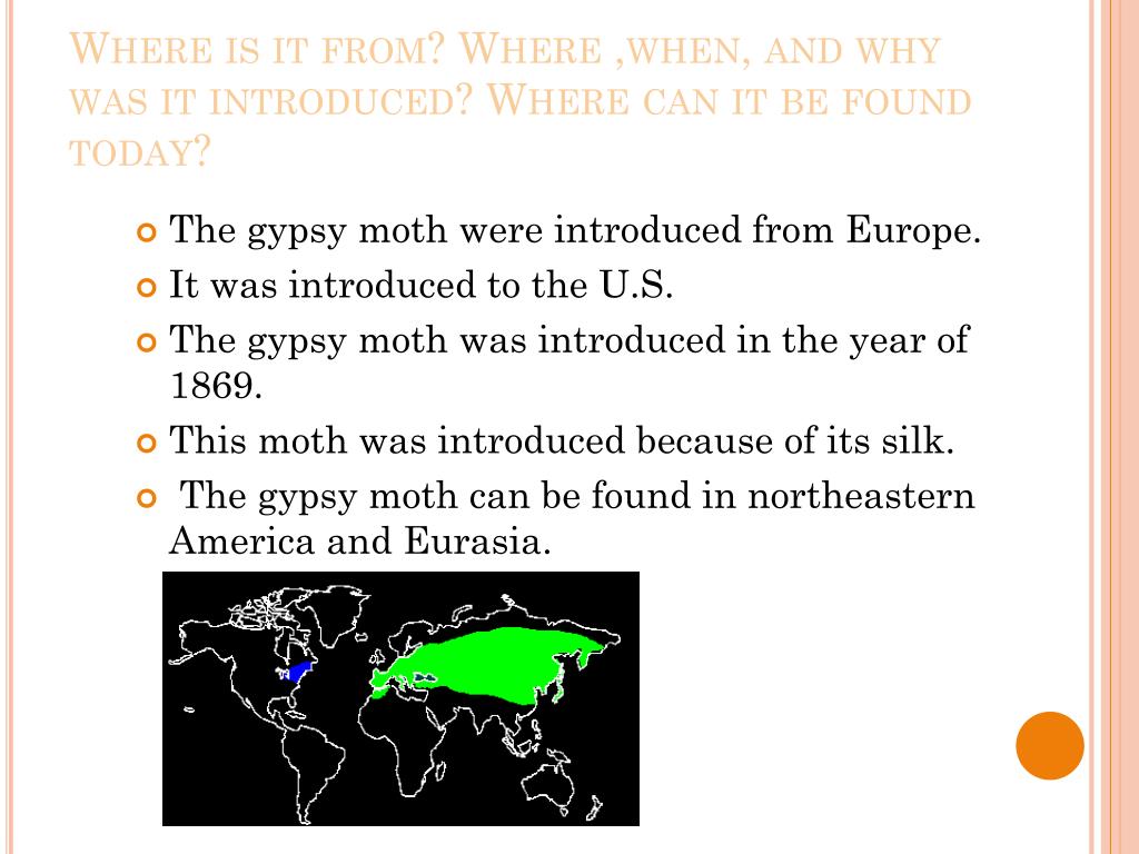 Where is it from? Where ,when, and why was it introduced? Where can it be found today? • The gypsy moth were introduced from Europe. • It was introduced to the U.S. • The gypsy moth was introduced in the year of 1869. • This moth was introduced because of its silk. • The gypsy moth can be found in northeastern America and Eurasia.
