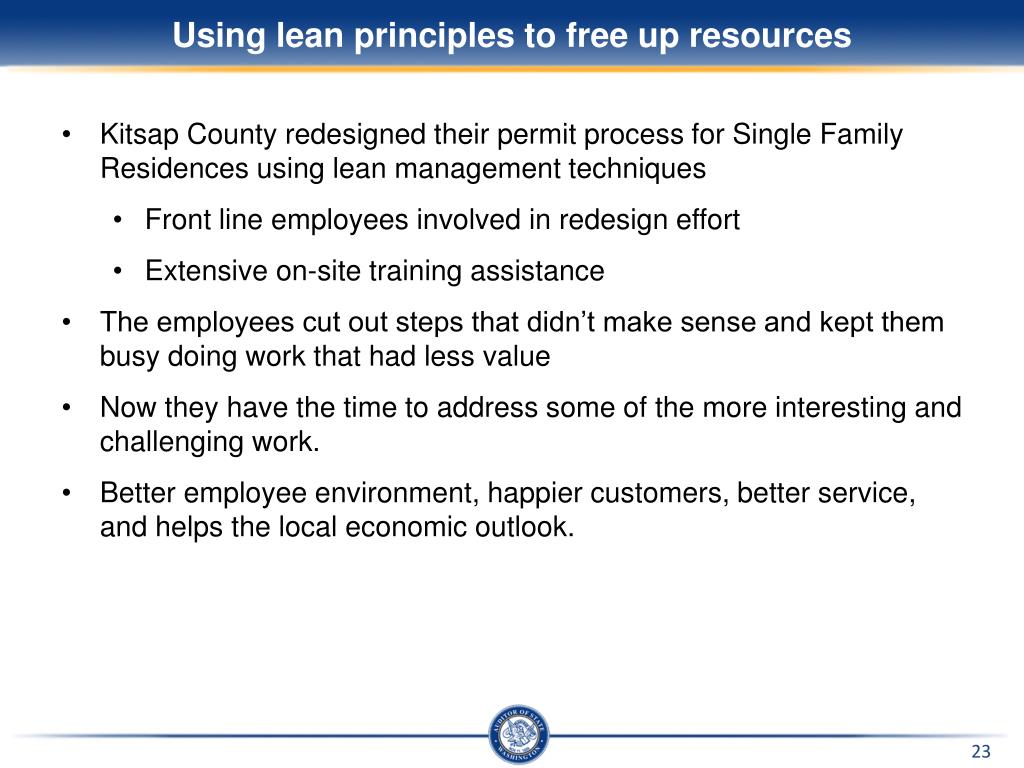 Using lean principles to free up resources • Kitsap County redesigned their permit process for Single Family Residences using lean management techniques • Front line employees involved in redesign effort • Extensive on-site training assistance • The employees cut out steps that didn’t make sense and kept them busy doing work that had less value • Now they have the time to address some of the more interesting and challenging work. • Better employee environment, happier customers, better service, and helps the local economic outlook.