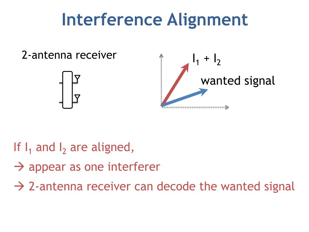 Interference Alignment If I1 and I2 are aligned, appear as one interferer 2-antenna receiver can decode the wanted signal 2-antenna receiver I1 + I2 wanted signal