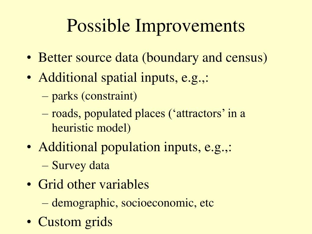 Possible Improvements • Better source data (boundary and census) • Additional spatial inputs, e.g.,: • parks (constraint) • roads, populated places (‘attractors’ in a heuristic model) • Additional population inputs, e.g.,: • Survey data • Grid other variables • demographic, socioeconomic, etc • Custom grids