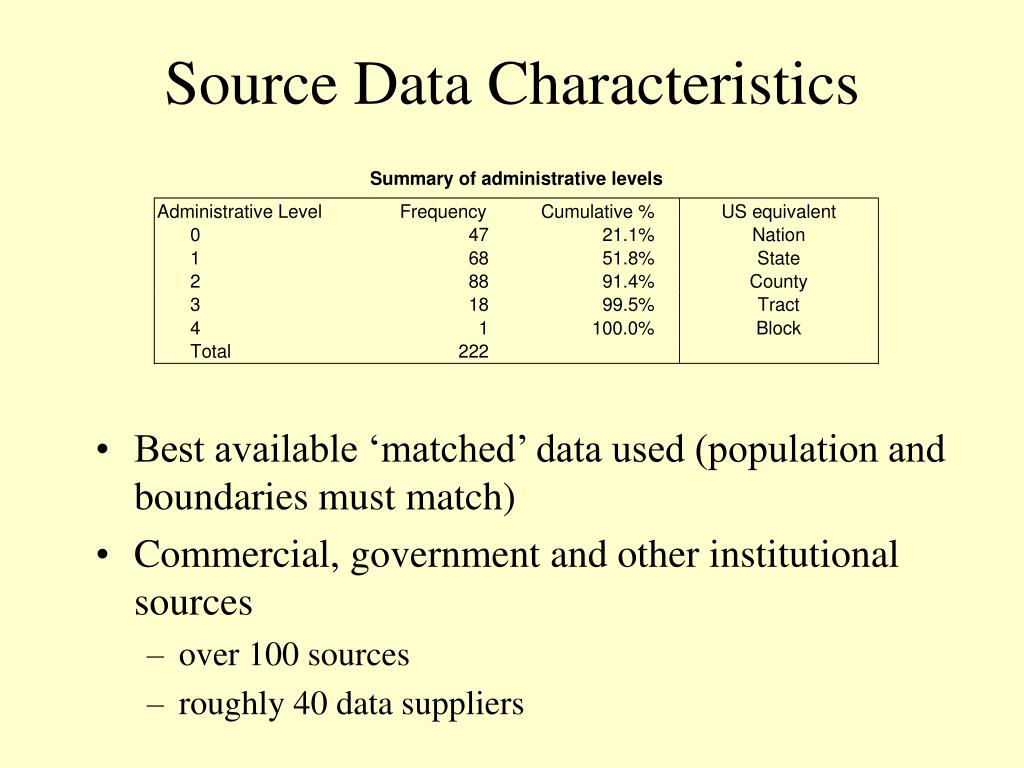 Best available ‘matched’ data used (population and boundaries must match) Commercial, government and other institutional sources over 100 sources roughly 40 data suppliers Source Data Characteristics