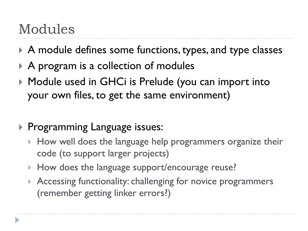 Modules • A module defines some functions, types, and type classes • A program is a collection of modules • Module used in GHCi is Prelude (you can import into your own files, to get the same environment) • Programming Language issues: • How well does the language help programmers organize their code (to support larger projects) • How does the language support/encourage reuse? • Accessing functionality: challenging for novice programmers (remember getting linker errors?)