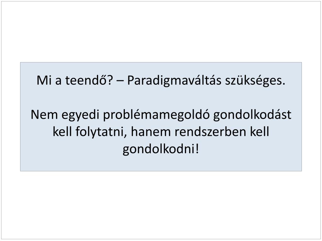 Mi a teendő? – Paradigmaváltás szükséges.Nem egyedi problémamegoldó gondolkodást kell folytatni, hanem rendszerben kell gondolkodni!
