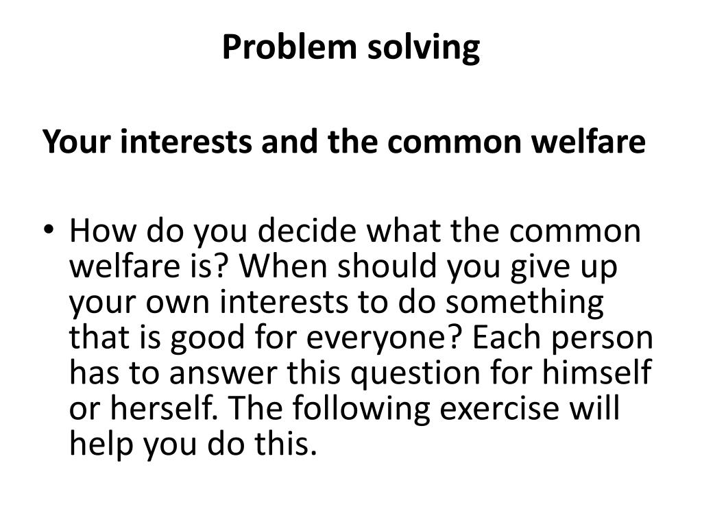 Problem solving Your interests and the common welfare • How do you decide what the common welfare is? When should you give up your own interests to do something that is good for everyone? Each person has to answer this question for himself or herself. The following exercise will help you do this.