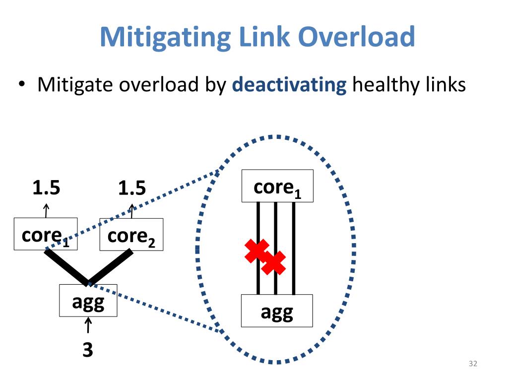 Mitigating Link Overload • Mitigate overload by deactivatinghealthy links 1.5 1.5 core1 core2 agg core1 3 agg