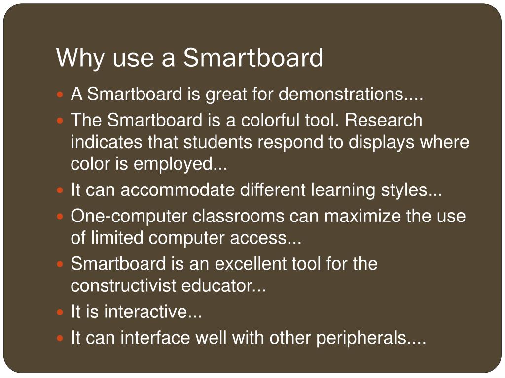 Why use a Smartboard • A Smartboard is great for demonstrations.... • The Smartboard is a colorful tool. Research indicates that students respond to displays where color is employed... • It can accommodate different learning styles... • One-computer classrooms can maximize the use of limited computer access... • Smartboard is an excellent tool for the constructivist educator... • It is interactive... • It can interface well with other peripherals....
