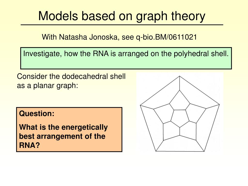 Models based on graph theory With Natasha Jonoska, see q-bio.BM/0611021 Investigate, how the RNA is arranged on the polyhedral shell. Consider the dodecahedral shell as a planar graph: Question: What is the energetically best arrangement of the RNA?