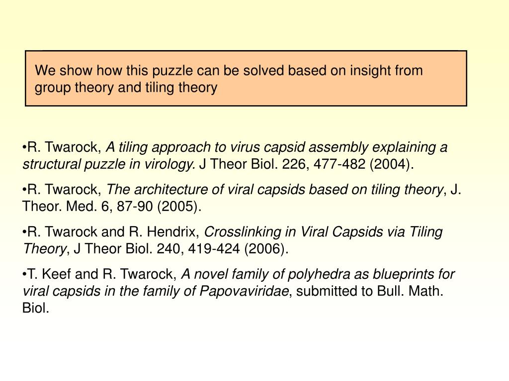 We show how this puzzle can be solved based on insight from group theory and tiling theory • R. Twarock, A tiling approach to virus capsid assembly explaining a structural puzzle in virology. J Theor Biol. 226, 477-482 (2004). • R. Twarock, The architecture of viral capsids based on tiling theory, J. Theor. Med. 6, 87-90 (2005). • R. Twarock and R. Hendrix, Crosslinking in Viral Capsids via Tiling Theory, J Theor Biol. 240, 419-424 (2006). • T. Keef and R. Twarock, A novel family of polyhedra as blueprints for viral capsids in the family of Papovaviridae, submitted to Bull. Math. Biol.