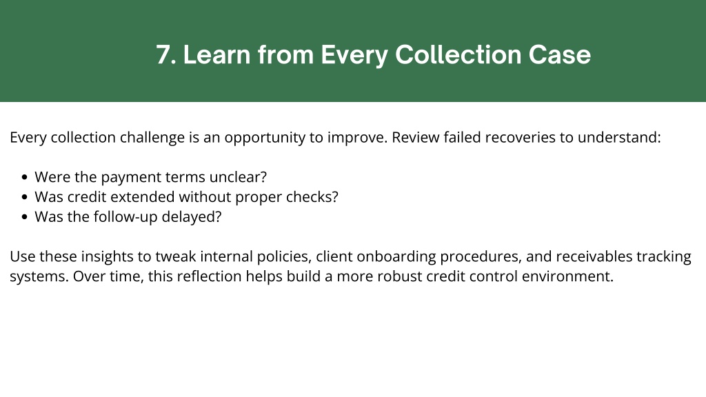 7. Learn from Every Collection Case Every collection challenge is an opportunity to improve. Review failed recoveries to understand: Were the payment terms unclear? Was credit extended without proper checks? Was the follow-up delayed? Use these insights to tweak internal policies, client onboarding procedures, and receivables tracking systems. Over time, this reflection helps build a more robust credit control environment.