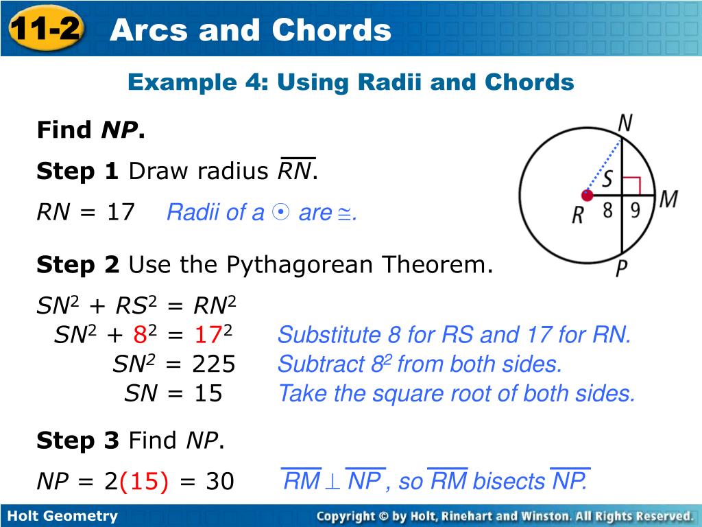 Step 1 Draw radius RN. RM NP , so RM bisects NP. Example 4: Using Radii and Chords Find NP. RN = 17 Radii of a are . Step 2 Use the Pythagorean Theorem. SN2 + RS2 = RN2 SN2 + 82 = 172 Substitute 8 for RS and 17 for RN. SN2 = 225 Subtract 82 from both sides. SN= 15 Take the square root of both sides. Step 3 Find NP. NP= 2(15) = 30