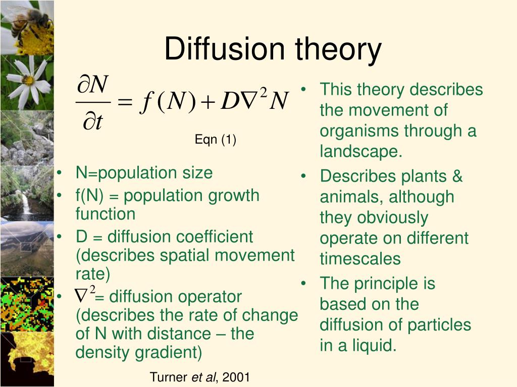 Diffusion theory • This theory describes the movement of organisms through a landscape. • Describes plants & animals, although they obviously operate on different timescales • The principle is based on the diffusion of particles in a liquid. Eqn (1) • N=population size • f(N) = population growth function • D = diffusion coefficient (describes spatial movement rate) • = diffusion operator (describes the rate of change of N with distance – the density gradient) Turner et al, 2001
