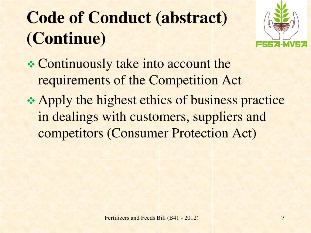 FSSA Code of Conduct (abstract) Act in accordance with the letter and spirit of laws and regulations which have relevance on the fertilizer and agricultural lime industries. Support and promote manufacturing, production and application practices with due concern for human health and the environment. Fertilizers and Feeds Bill (B41 - 2012)