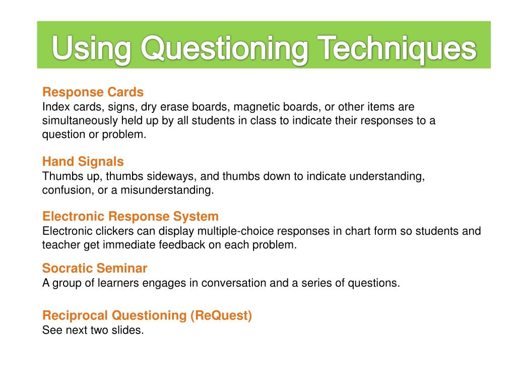 Using Questioning Techniques Response Cards Index cards, signs, dry erase boards, magnetic boards, or other items are simultaneously held up by all students in class to indicate their responses to a question or problem. Hand Signals Thumbs up, thumbs sideways, and thumbs down to indicate understanding, confusion, or a misunderstanding. Electronic Response System Electronic clickers can display multiple-choice responses in chart form so students and teacher get immediate feedback on each problem. Socratic Seminar A group of learners engages in conversation and a series of questions. Reciprocal Questioning (ReQuest) See next two slides.
