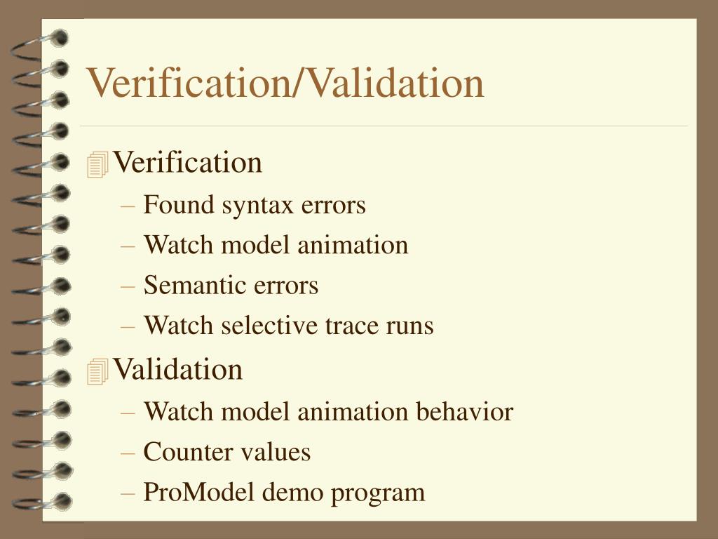 Verification/Validation • Verification • Found syntax errors • Watch model animation • Semantic errors • Watch selective trace runs • Validation • Watch model animation behavior • Counter values • ProModel demo program
