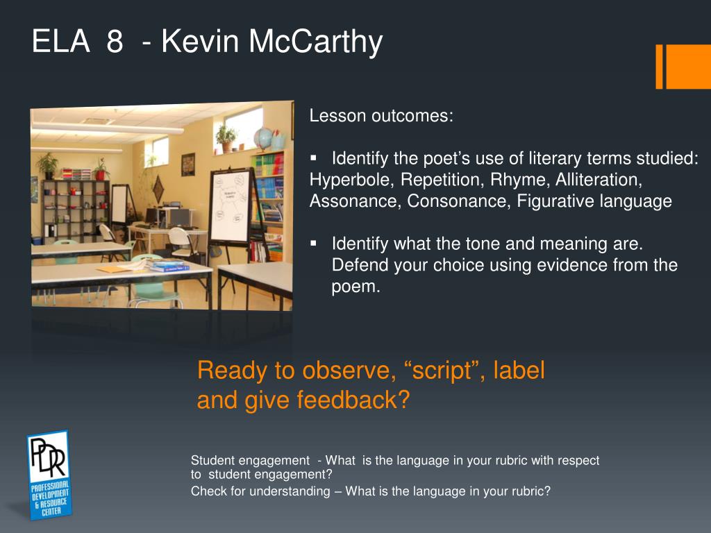 ELA 8 - Kevin McCarthy • Lesson outcomes: • Identify the poet’s use of literary terms studied: • Hyperbole, Repetition, Rhyme, Alliteration, Assonance, Consonance, Figurative language • Identify what the tone and meaning are. Defend your choice using evidence from the poem. Ready to observe, “script”, label and give feedback? Student engagement - What is the language in your rubric with respect to student engagement? Check for understanding – What is the language in your rubric?