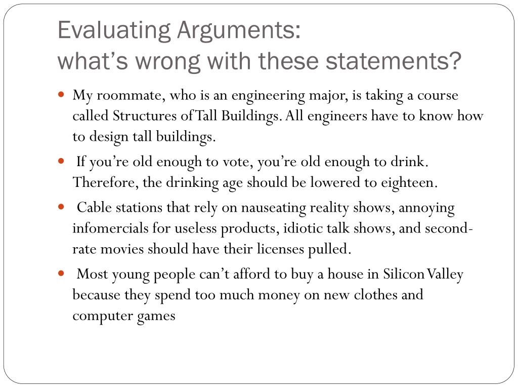 Evaluating Arguments:what’s wrong with these statements? • My roommate, who is an engineering major, is taking a course called Structures of Tall Buildings. All engineers have to know how to design tall buildings. • If you’re old enough to vote, you’re old enough to drink. Therefore, the drinking age should be lowered to eighteen. • Cable stations that rely on nauseating reality shows, annoying infomercials for useless products, idiotic talk shows, and second-rate movies should have their licenses pulled. • Most young people can’t afford to buy a house in Silicon Valley because they spend too much money on new clothes and computer games