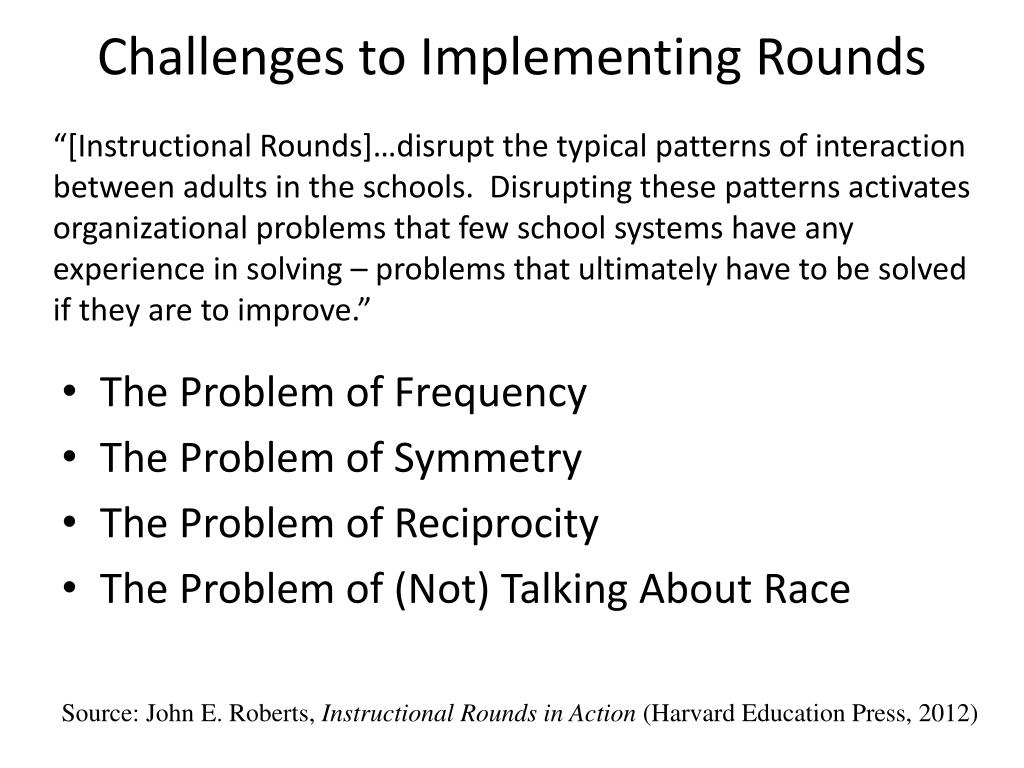 Challenges to Implementing Rounds “[Instructional Rounds]…disrupt the typical patterns of interaction between adults in the schools. Disrupting these patterns activates organizational problems that few school systems have any experience in solving – problems that ultimately have to be solved if they are to improve.” • The Problem of Frequency • The Problem of Symmetry • The Problem of Reciprocity • The Problem of (Not) Talking About Race Source: John E. Roberts, Instructional Rounds in Action (Harvard Education Press, 2012)