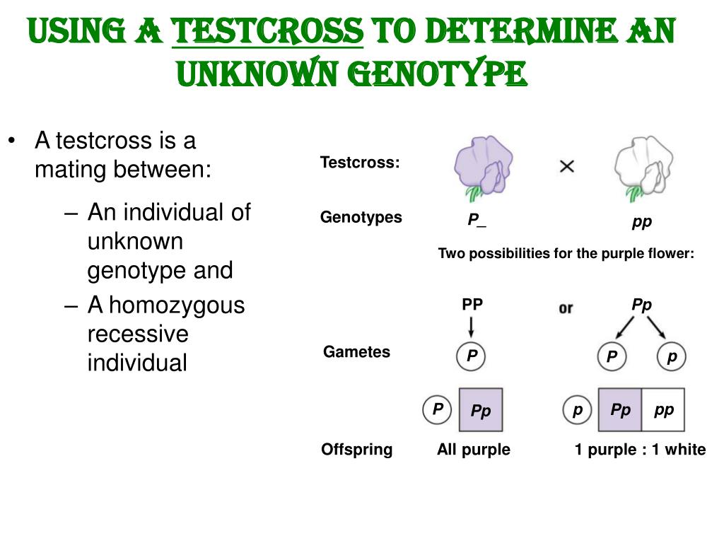 A testcross is a mating between: Using a Testcross to Determine an Unknown Genotype Testcross: • An individual of unknown genotype and • A homozygous recessive individual Genotypes P_ pp Two possibilities for the purple flower: PP Pp Gametes P p P P p pp Pp Pp Offspring All purple 1 purple : 1 white