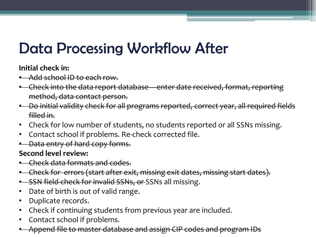 Data Processing Workflow Before • Initial check in: • Add school ID to each row. • Check into the data report database—enter date received, format, reporting method, data contact person. • Do initial validity check for all programs reported, correct year, all required fields filled in. • Check for low number of students, no students reported or all SSNs missing. • Contact school if problems. Re-check corrected file. • Data entry of hard copy forms. • Second level review: • Check data formats and codes. • Check for errors (start after exit, missing exit dates, missing start dates). • Check for invalid SSNs, or SSNs all missing. • Date of birth is out of valid range. • Duplicate records. • Check if continuing students from previous year are included. • Contact school if problems. • Append file to master database and assign CIP codes and program IDs.