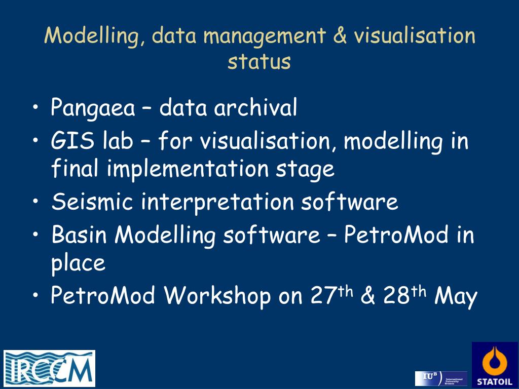 Modelling, data management & visualisationstatus • Pangaea – data archival • GIS lab – for visualisation, modelling in final implementation stage • Seismic interpretation software • Basin Modelling software – PetroMod in place • PetroMod Workshop on 27th & 28th May