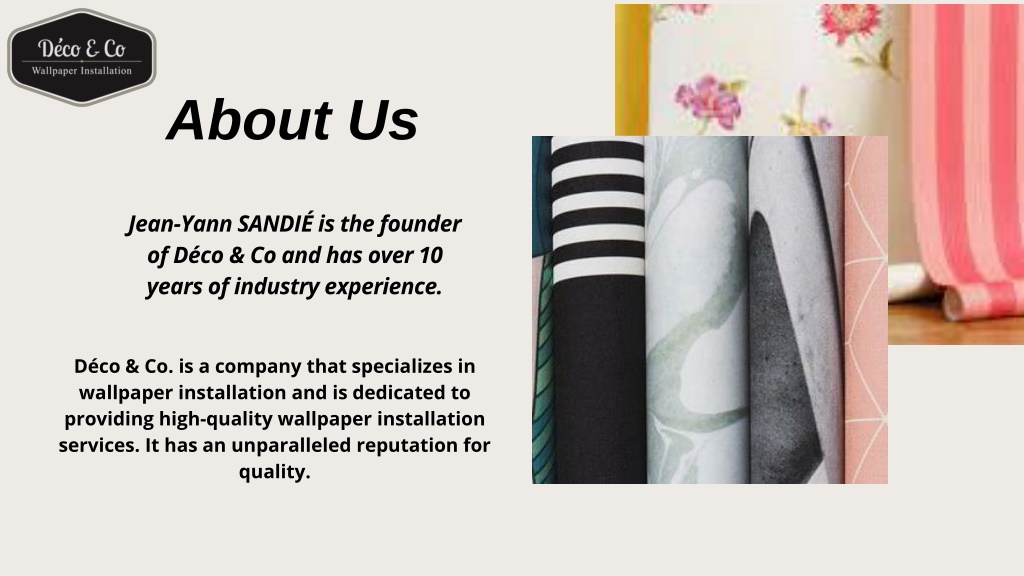 About Us Jean-Yann SANDIÉ is the founder of Déco & Co and has over 10 years of industry experience. Déco & Co. is a company that specializes in wallpaper installation and is dedicated to providing high-quality wallpaper installation services. It has an unparalleled reputation for quality.