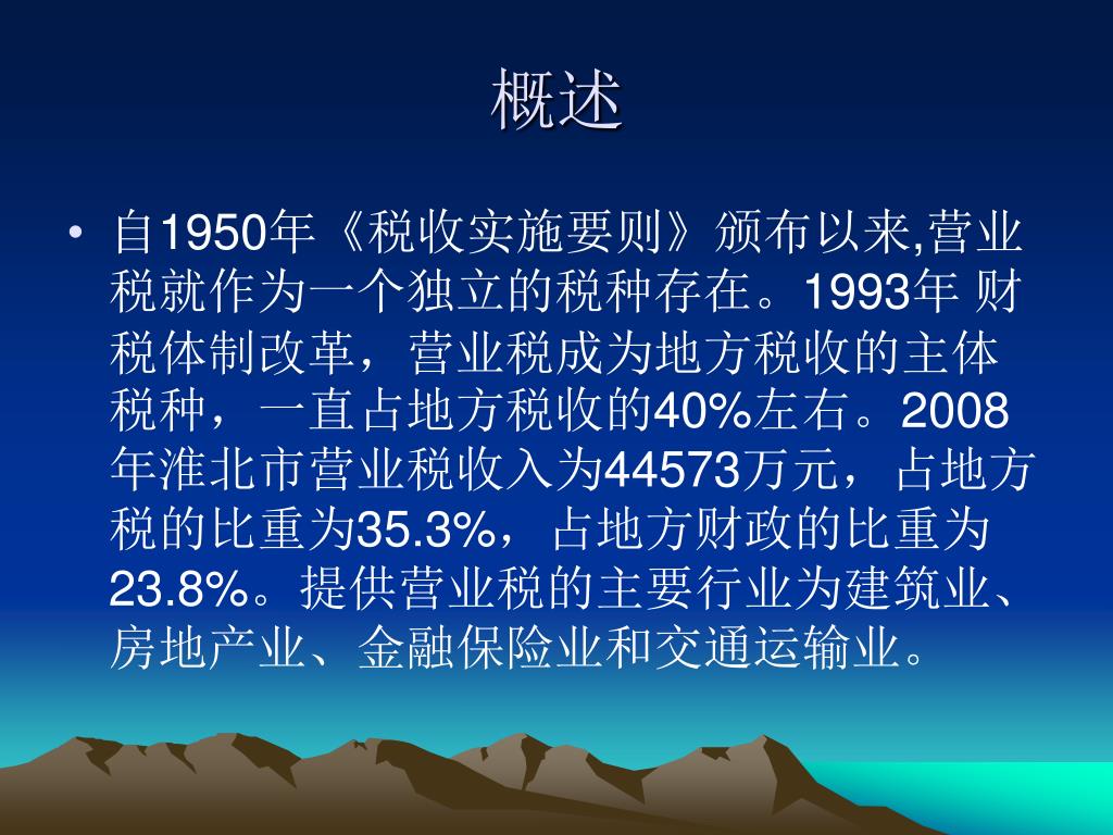 概述 • 自1950年《税收实施要则》颁布以来,营业税就作为一个独立的税种存在。1993年 财税体制改革,营业税成为地方税收的主体税种,一直占地方税收的40%左右。2008年淮北市营业税收入为44573万元,占地方税的比重为35.3%,占地方财政的比重为23.8%。提供营业税的主要行业为建筑业、房地产业、金融保险业和交通运输业。