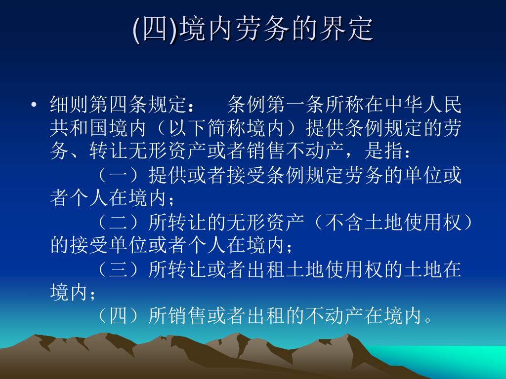 (四)境内劳务的界定 • 细则第四条规定: 条例第一条所称在中华人民共和国境内(以下简称境内)提供条例规定的劳务、转让无形资产或者销售不动产,是指: (一)提供或者接受条例规定劳务的单位或者个人在境内; (二)所转让的无形资产(不含土地使用权)的接受单位或者个人在境内; (三)所转让或者出租土地使用权的土地在境内; (四)所销售或者出租的不动产在境内。