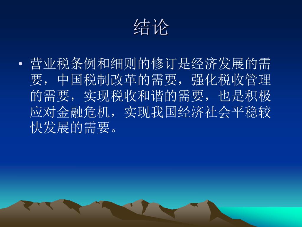 结论 • 营业税条例和细则的修订是经济发展的需要,中国税制改革的需要,强化税收管理的需要,实现税收和谐的需要,也是积极应对金融危机,实现我国经济社会平稳较快发展的需要。
