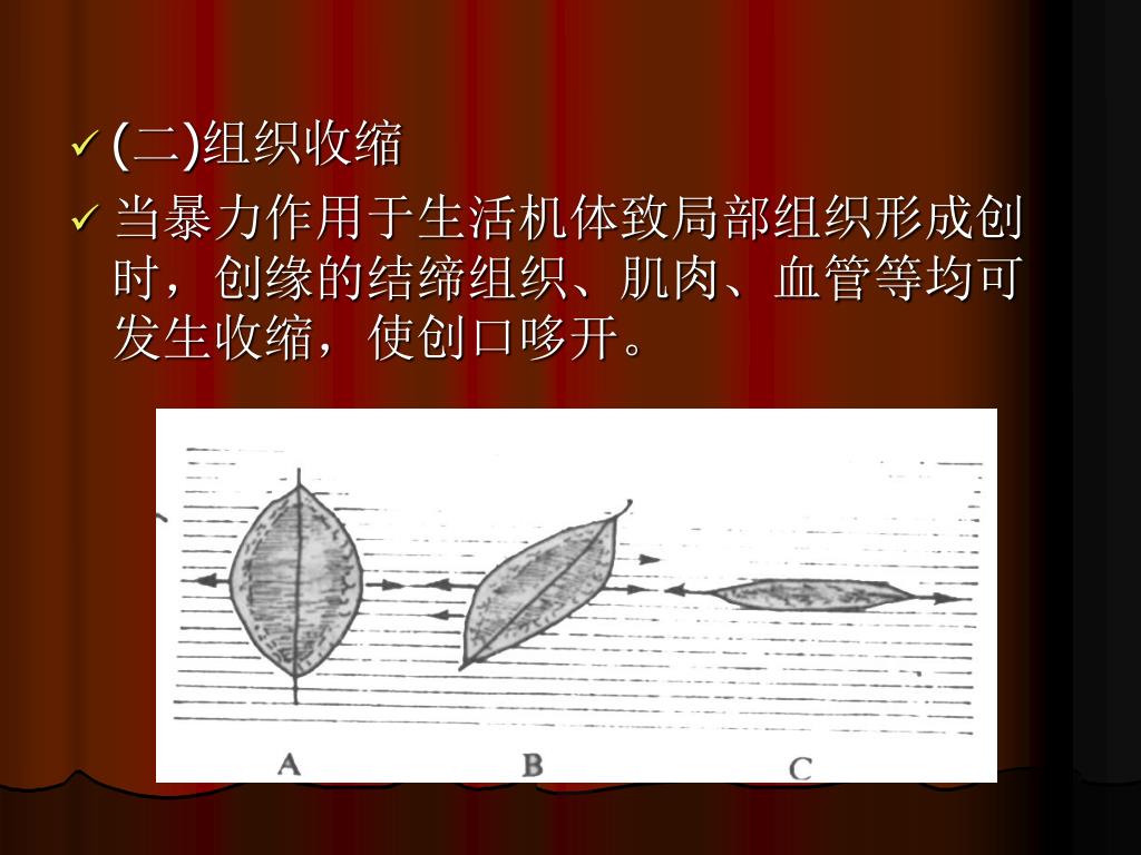 (二)组织收缩 • 当暴力作用于生活机体致局部组织形成创时,创缘的结缔组织、肌肉、血管等均可发生收缩,使创口哆开。