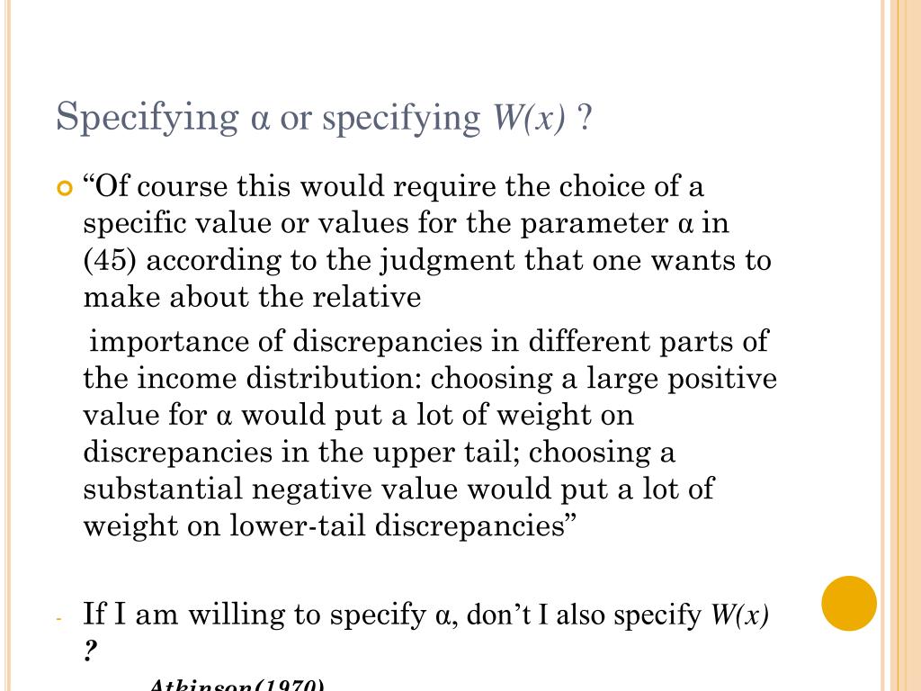 Specifying α or specifying W(x) ? “Of course this would require the choice of a specific value or values for the parameter αin (45) according to the judgment that one wants to make about the relative importance of discrepancies in different parts of the income distribution: choosing a large positive value for α would put a lot of weight on discrepancies in the upper tail; choosing a substantial negative value would put a lot of weight on lower-tail discrepancies” If I am willing to specify α, don’t I also specify W(x) ? Atkinson(1970)