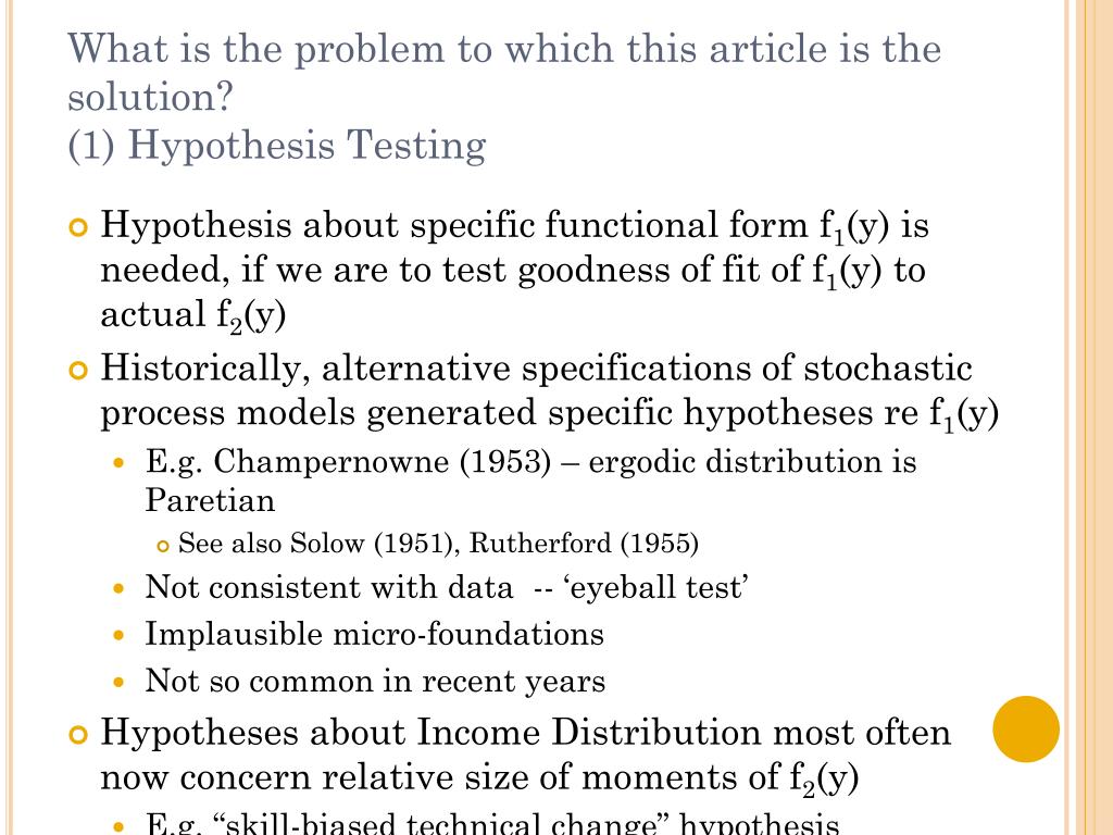 What is the problem to which this article is the solution? (1) Hypothesis Testing Hypothesis about specific functional form f1(y) is needed, if we are to test goodness of fit of f1(y) to actual f2(y) Historically, alternative specifications of stochastic process models generated specific hypotheses re f1(y) E.g. Champernowne (1953) – ergodic distribution is Paretian See also Solow (1951), Rutherford (1955) Not consistent with data -- ‘eyeball test’ Implausible micro-foundations Not so common in recent years Hypotheses about Income Distribution most often now concern relative size of moments of f2(y) E.g. “skill-biased technical change” hypothesis