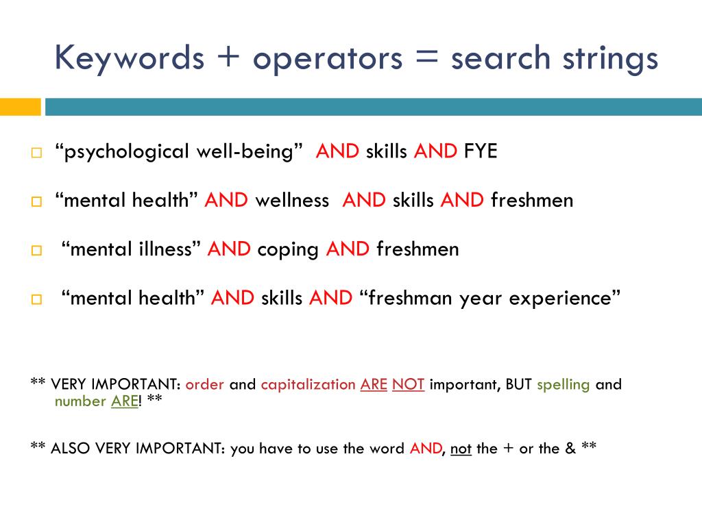 Keywords + operators = search strings • “psychological well-being” AND skills ANDFYE • “mental health” AND wellness AND skills AND freshmen • “mental illness” AND coping AND freshmen • “mental health” AND skills AND “freshman year experience” ** VERY IMPORTANT: order and capitalization ARENOTimportant, BUT spelling and number ARE! ** ** ALSO VERY IMPORTANT: you have to use the word AND, not the + or the & **