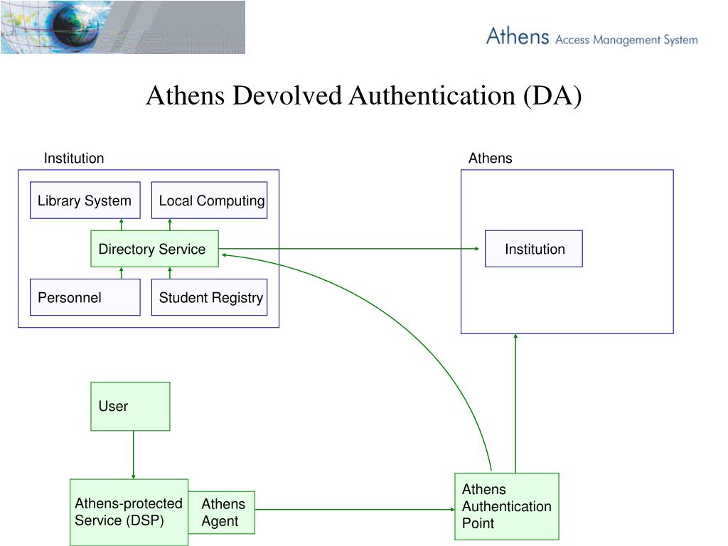 Institution Athens Personnel Student Registry Library System Local Computing Directory Service Institution User Athens Authentication Point Athens-protected Service (DSP) Athens Agent Athens Devolved Authentication (DA)