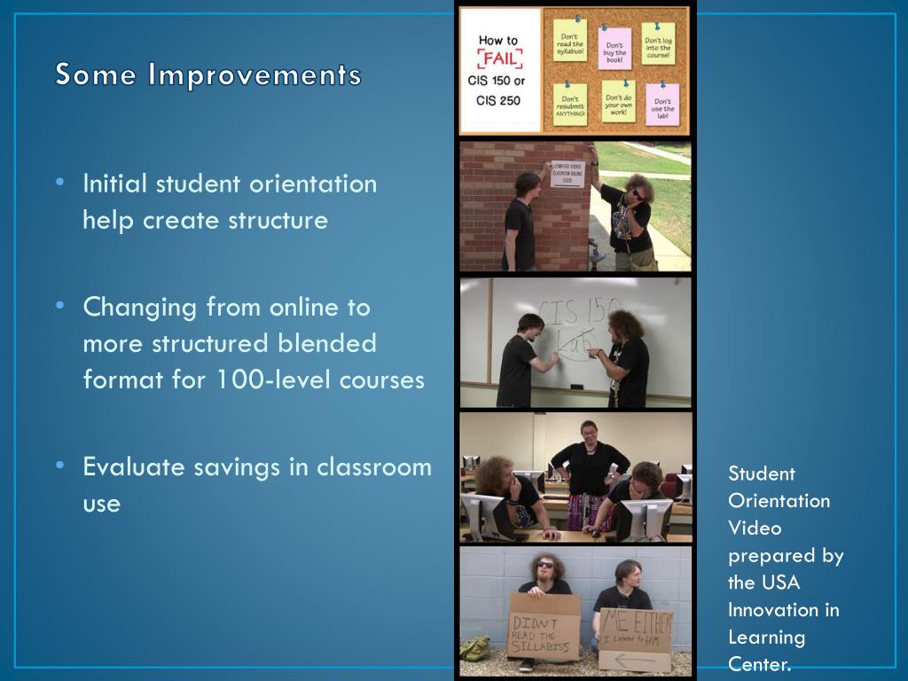 Some Improvements • Initial student orientation help create structure • Changing from online to more structured blended format for 100-level courses • Evaluate savings in classroom use Student Orientation Video prepared by the USA Innovation in Learning Center.