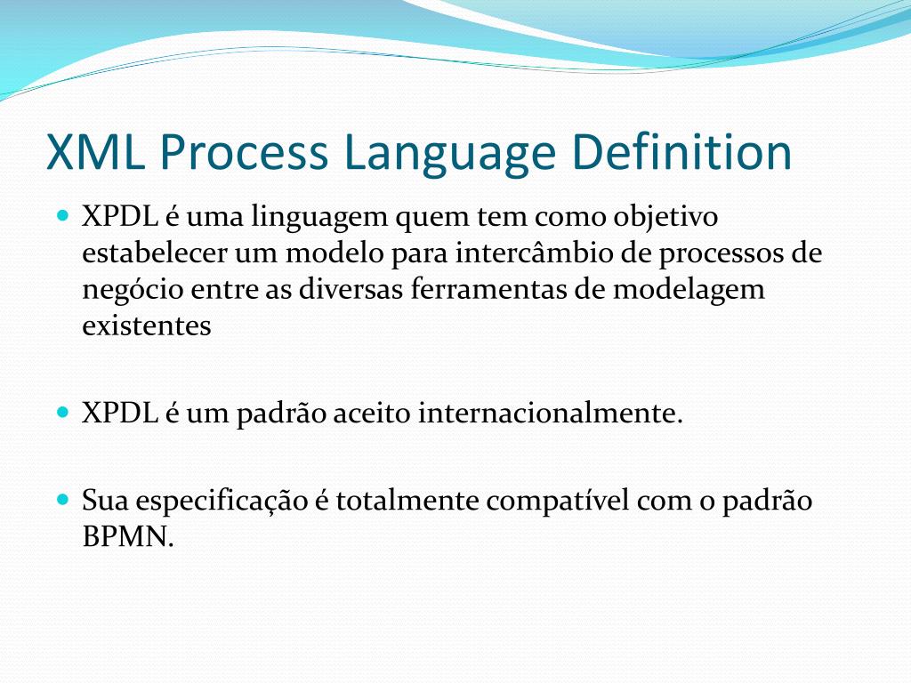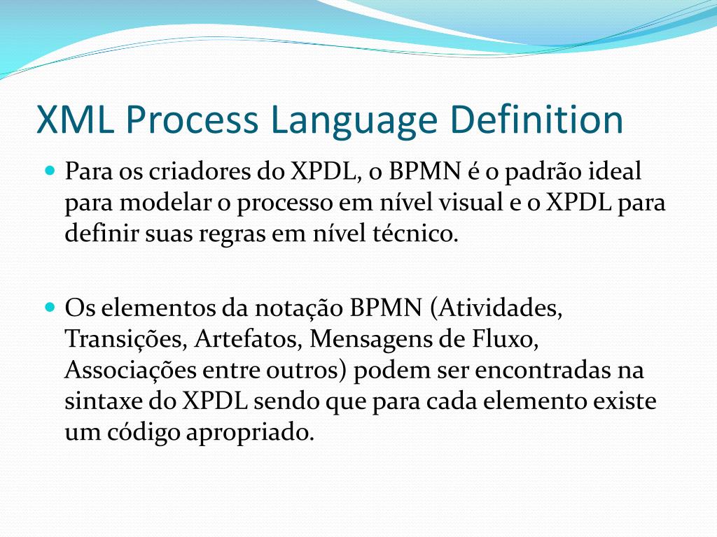 XML ProcessLanguageDefinition • Para os criadores do XPDL, o BPMN é o padrão ideal para modelar o processo em nível visual e o XPDL para definir suas regras em nível técnico. • Os elementos da notação BPMN (Atividades, Transições, Artefatos, Mensagens de Fluxo, Associações entre outros) podem ser encontradas na sintaxe do XPDL sendo que para cada elemento existe um código apropriado.