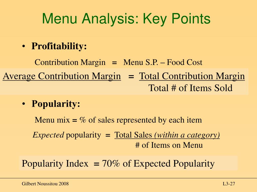 Menu Analysis: The Four Box Analysis High Profitability (CM) “Puzzles” “Stars” Popularity (Menu Mix) “Dogs” “Plowhorses” Low High Gilbert Noussitou 2008