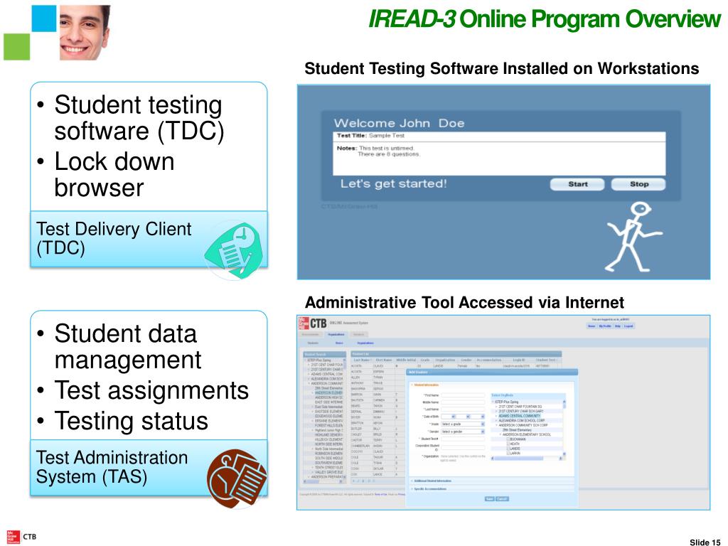 IDOE Online Testing Program Overview IREAD-3 Online Program Overview Student Testing Software Installed on Workstations Administrative Tool Accessed via Internet Slide 15