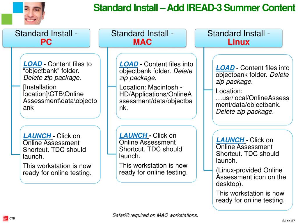 Standard Install – Add IREAD-3 Summer Content Install the TDC – Standard PC MAC Linux • Safari® required on MAC workstations. Slide 27