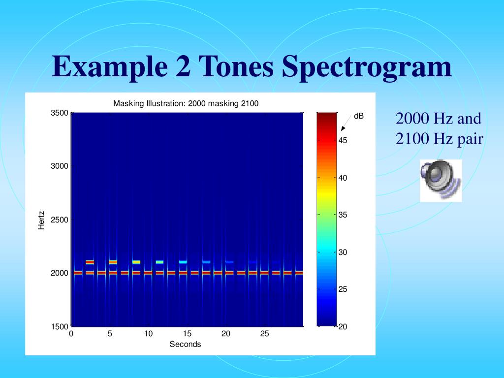 Example 2 Tones Generate 2 tones in the same critical band (at 2000 and one at 2100 Hz). Play a sequence of the pure reference tone followed by a combination of the test and reference tones where the test tone is reduce by 5 dB each time. Count the number of times you heard the test tone. Repeat with test tone at 3090 Hz.