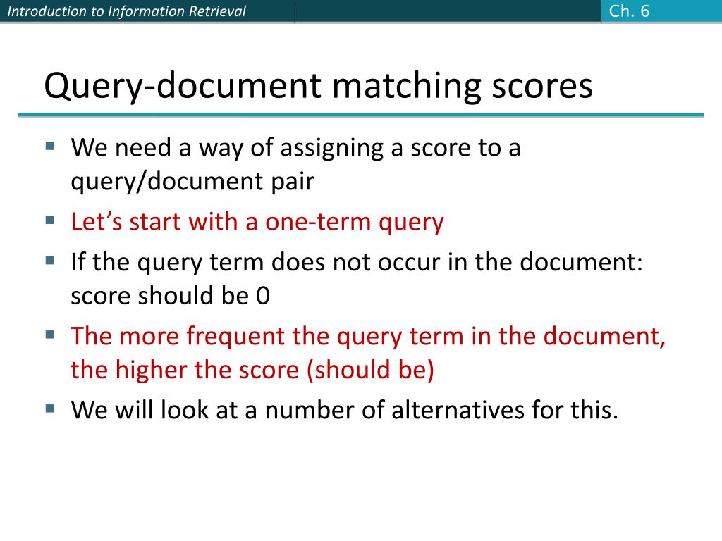 Ch. 6 Query-document matching scores • We need a way of assigning a score to a query/document pair • Let’s start with a one-term query • If the query term does not occur in the document: score should be 0 • The more frequent the query term in the document, the higher the score (should be) • We will look at a number of alternatives for this.