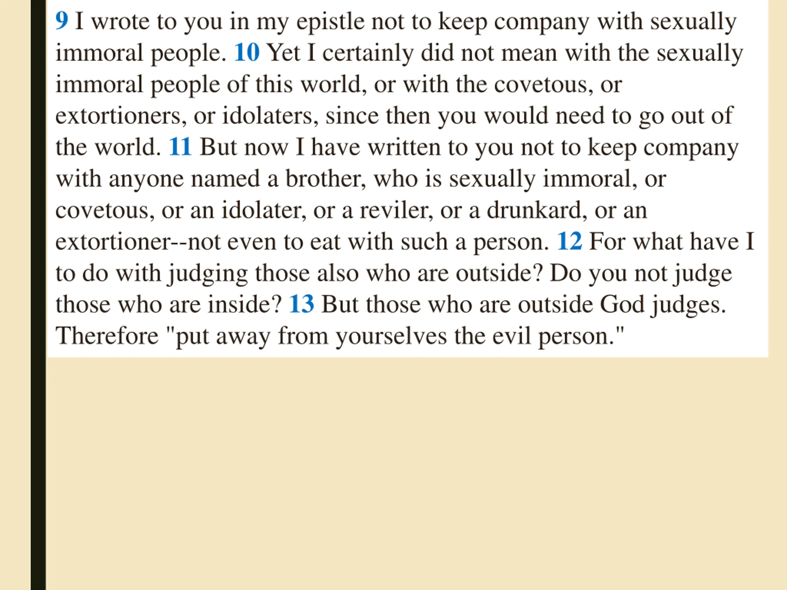 9 I wrote to you in my epistle not to keep company with sexually immoral people. 10 Yet I certainly did not mean with the sexually immoral people of this world, or with the covetous, or extortioners, or idolaters, since then you would need to go out of the world. 11 But now I have written to you not to keep company with anyone named a brother, who is sexually immoral, or covetous, or an idolater, or a reviler, or a drunkard, or an extortioner--not even to eat with such a person. 12 For what have I to do with judging those also who are outside? Do you not judge those who are inside? 13 But those who are outside God judges. Therefore "put away from yourselves the evil person."