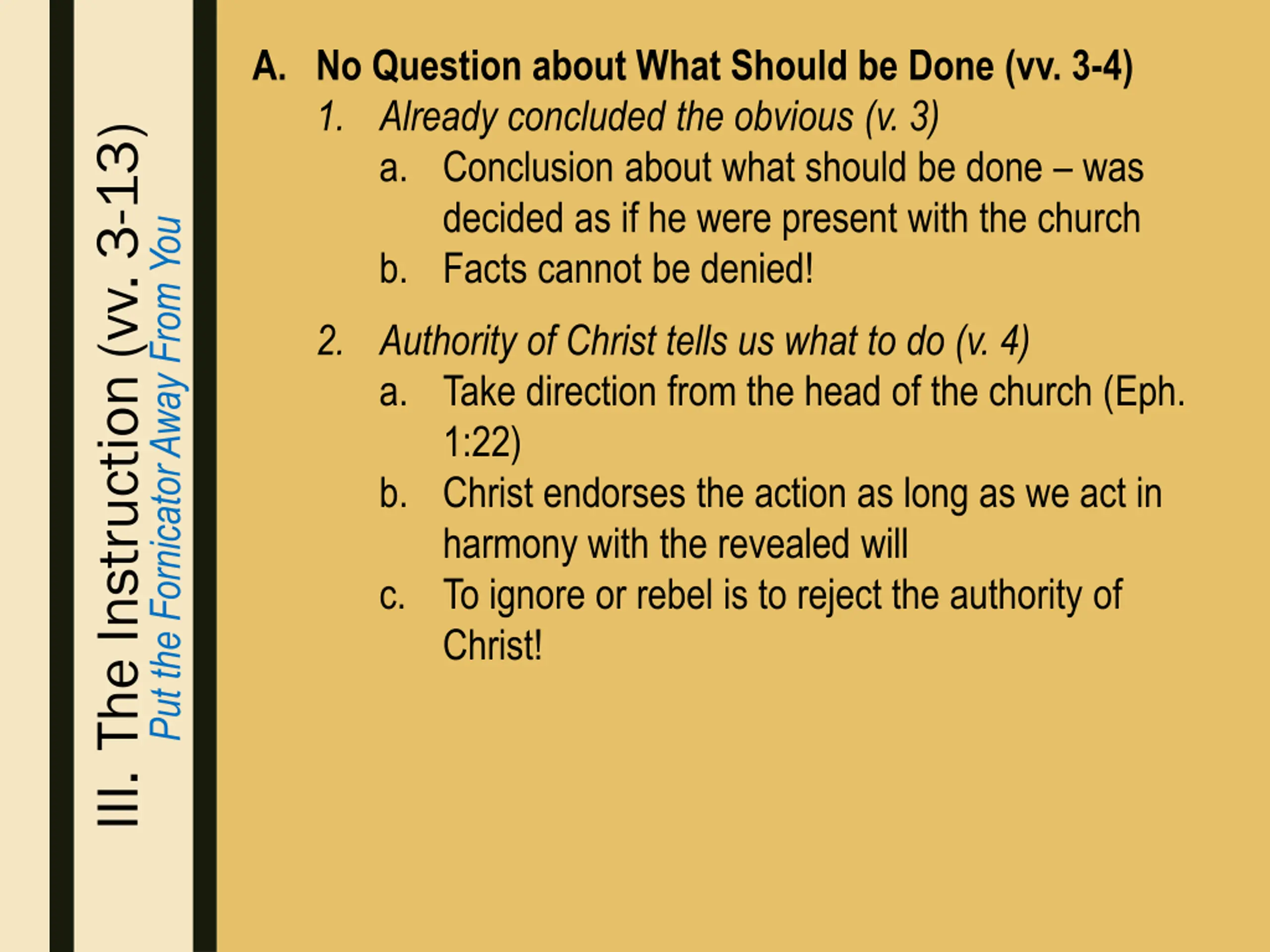 A. No Question about What Should be Done (vv. 3-4) 1. Already concluded the obvious (v. 3) a. Conclusion about what should be done – was decided as if he were present with the church b. Facts cannot be denied! III. The Instruction (vv. 3-13) Put the Fornicator Away From You 2. Authority of Christ tells us what to do (v. 4) a. Take direction from the head of the church (Eph. 1:22) b. Christ endorses the action as long as we act in harmony with the revealed will c. To ignore or rebel is to reject the authority of Christ!