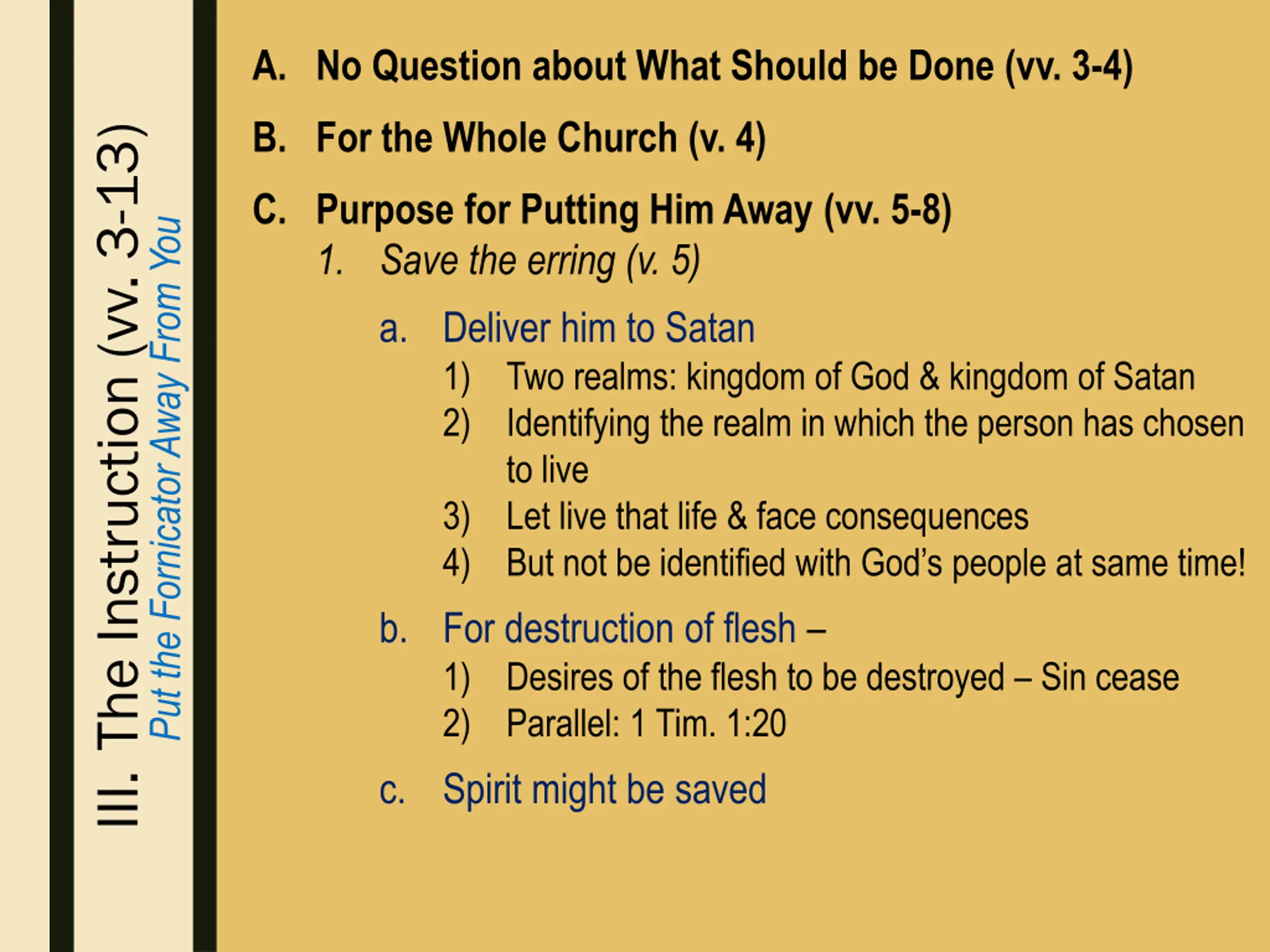 A. No Question about What Should be Done (vv. 3-4) B. For the Whole Church (v. 4) III. The Instruction (vv. 3-13) C. Purpose for Putting Him Away (vv. 5-8) 1. Save the erring (v. 5) a. Deliver him to Satan 1) Two realms: kingdom of God & kingdom of Satan 2) Identifying the realm in which the person has chosen to live 3) Let live that life & face consequences 4) But not be identified with God’s people at same time! b. For destruction of flesh – 1) Desires of the flesh to be destroyed – Sin cease 2) Parallel: 1 Tim. 1:20 c. Spirit might be saved Put the Fornicator Away From You