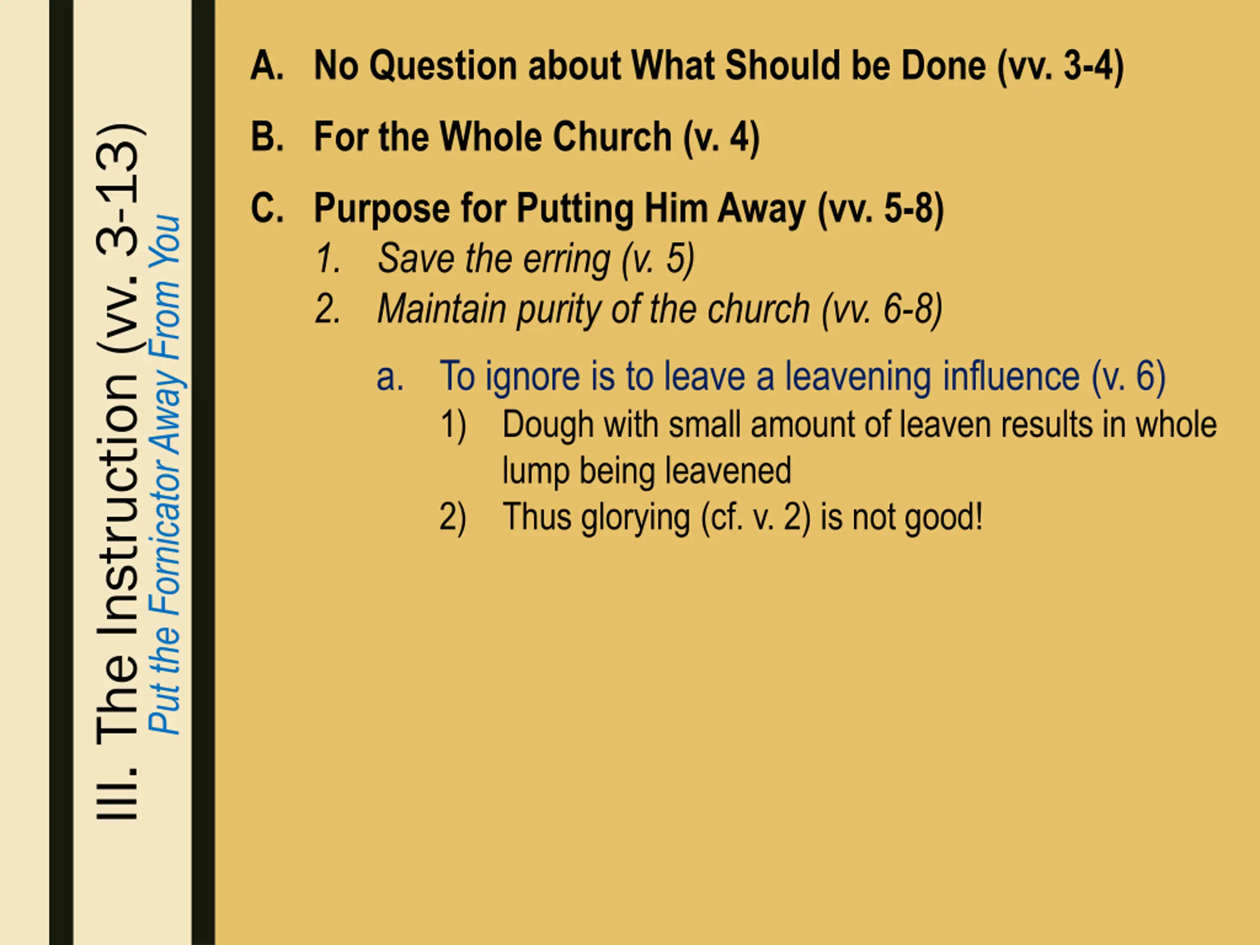 A. No Question about What Should be Done (vv. 3-4) B. For the Whole Church (v. 4) III. The Instruction (vv. 3-13) C. Purpose for Putting Him Away (vv. 5-8) 1. Save the erring (v. 5) 2. Maintain purity of the church (vv. 6-8) a. To ignore is to leave a leavening influence (v. 6) 1) Dough with small amount of leaven results in whole lump being leavened 2) Thus glorying (cf. v. 2) is not good! Put the Fornicator Away From You