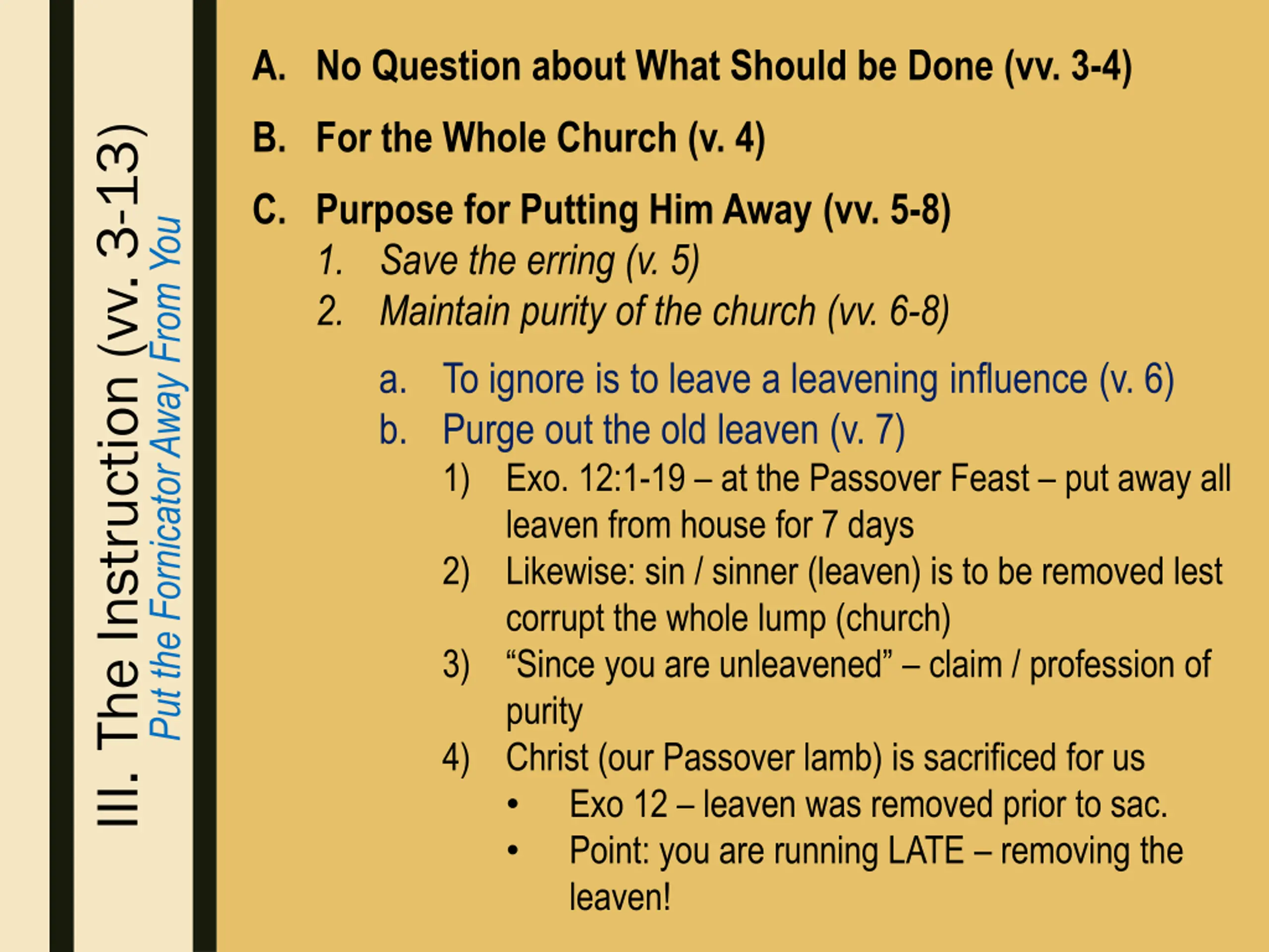 A. No Question about What Should be Done (vv. 3-4) B. For the Whole Church (v. 4) III. The Instruction (vv. 3-13) C. Purpose for Putting Him Away (vv. 5-8) 1. Save the erring (v. 5) 2. Maintain purity of the church (vv. 6-8) a. To ignore is to leave a leavening influence (v. 6) b. Purge out the old leaven (v. 7) 1) Exo. 12:1-19 – at the Passover Feast – put away all leaven from house for 7 days 2) Likewise: sin / sinner (leaven) is to be removed lest corrupt the whole lump (church) 3) “Since you are unleavened” – claim / profession of purity 4) Christ (our Passover lamb) is sacrificed for us • Exo 12 – leaven was removed prior to sac. • Point: you are running LATE – removing the leaven! Put the Fornicator Away From You