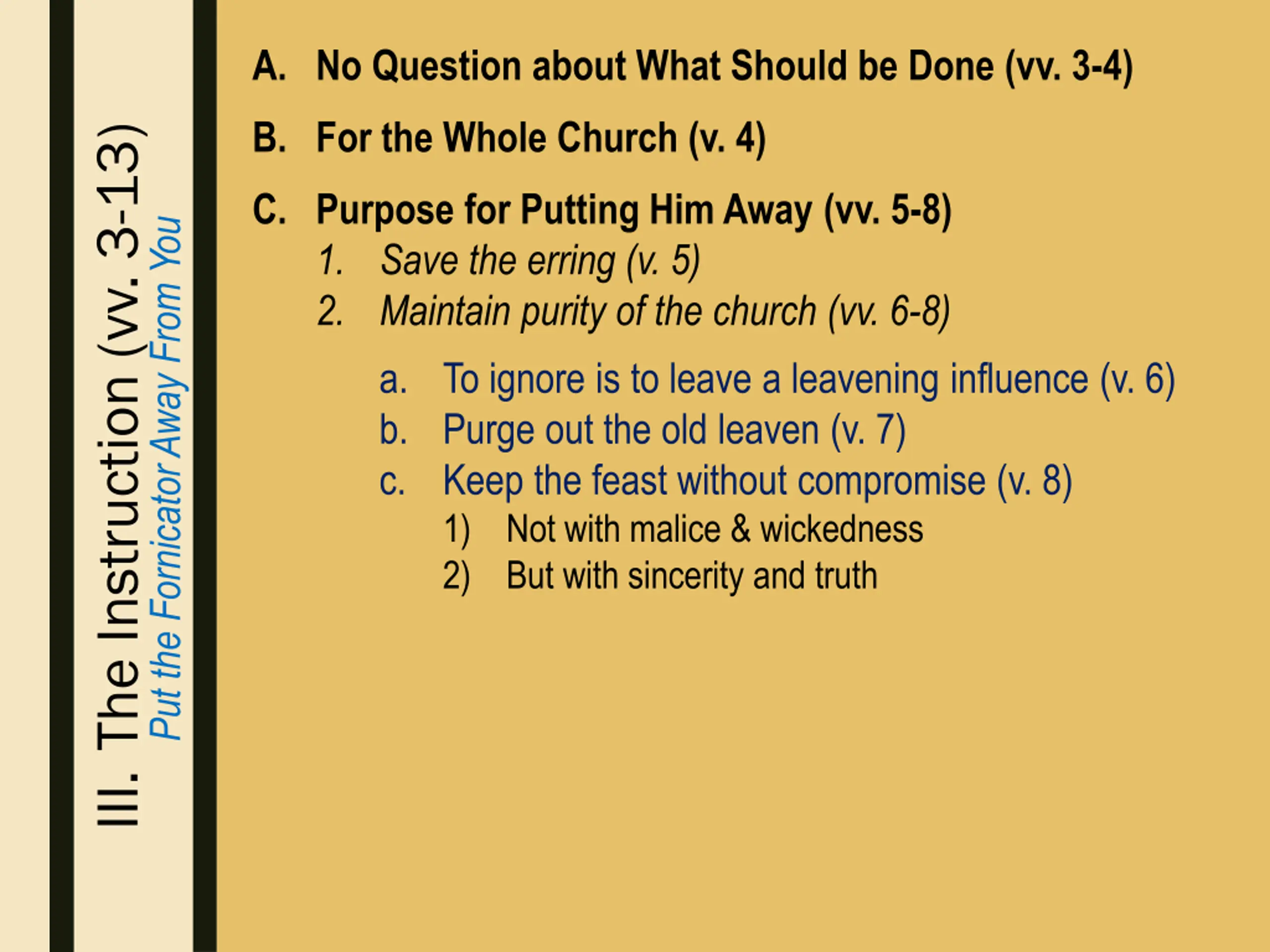 A. No Question about What Should be Done (vv. 3-4) B. For the Whole Church (v. 4) III. The Instruction (vv. 3-13) C. Purpose for Putting Him Away (vv. 5-8) 1. Save the erring (v. 5) 2. Maintain purity of the church (vv. 6-8) a. To ignore is to leave a leavening influence (v. 6) b. Purge out the old leaven (v. 7) c. Keep the feast without compromise (v. 8) 1) Not with malice & wickedness 2) But with sincerity and truth Put the Fornicator Away From You