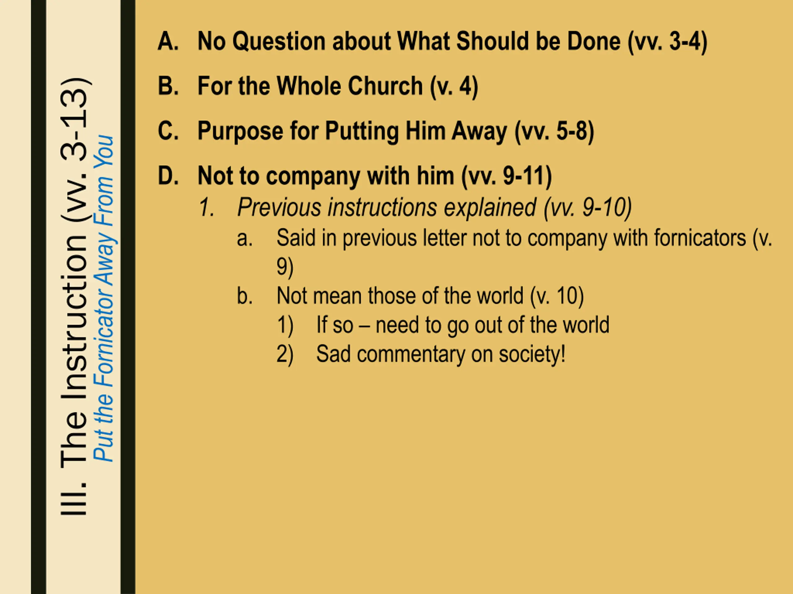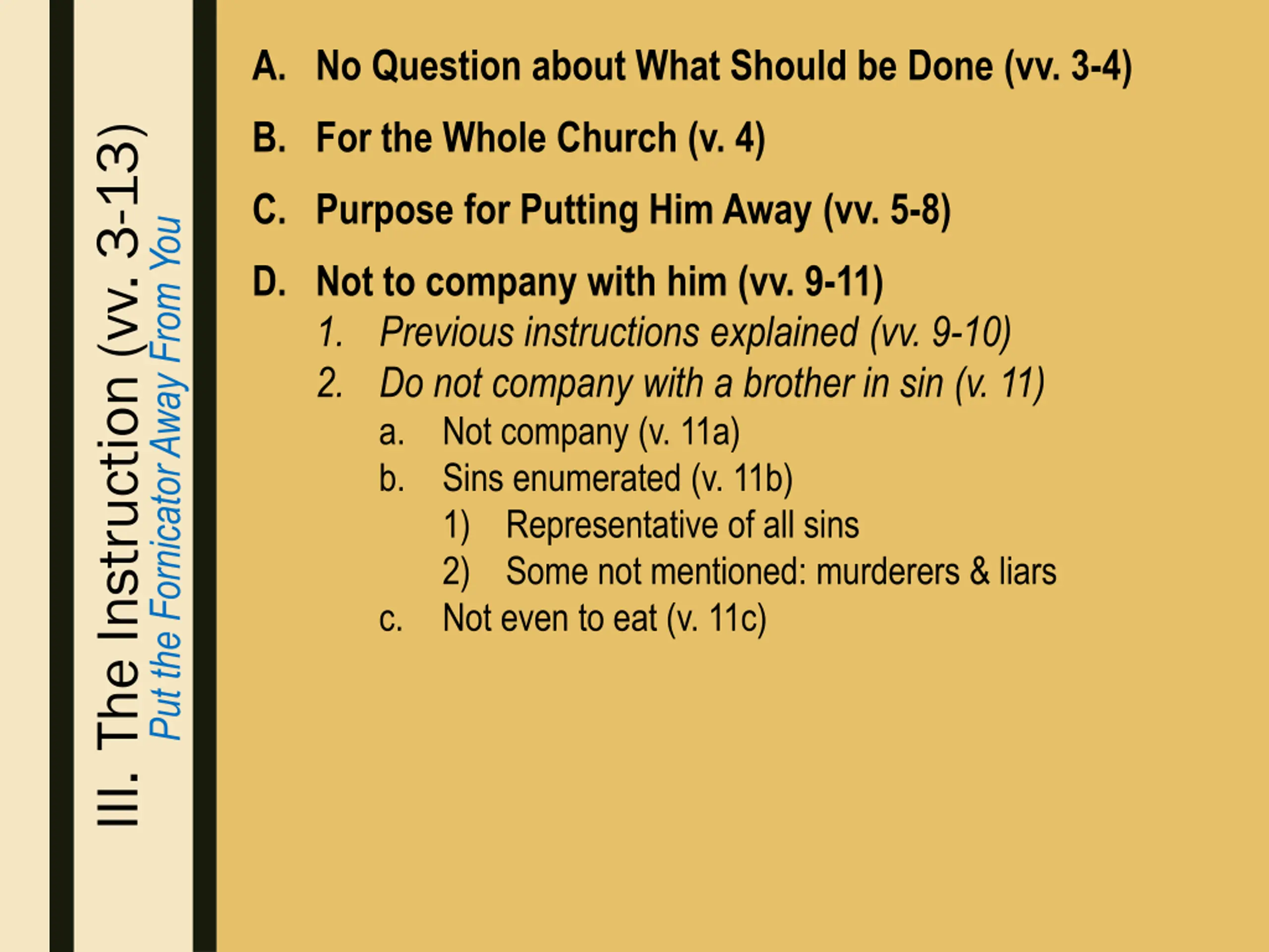 A. No Question about What Should be Done (vv. 3-4) B. For the Whole Church (v. 4) III. The Instruction (vv. 3-13) C. Purpose for Putting Him Away (vv. 5-8) Put the Fornicator Away From You D. Not to company with him (vv. 9-11) 1. Previous instructions explained (vv. 9-10) 2. Do not company with a brother in sin (v. 11) a. Not company (v. 11a) b. Sins enumerated (v. 11b) 1) Representative of all sins 2) Some not mentioned: murderers & liars c. Not even to eat (v. 11c)