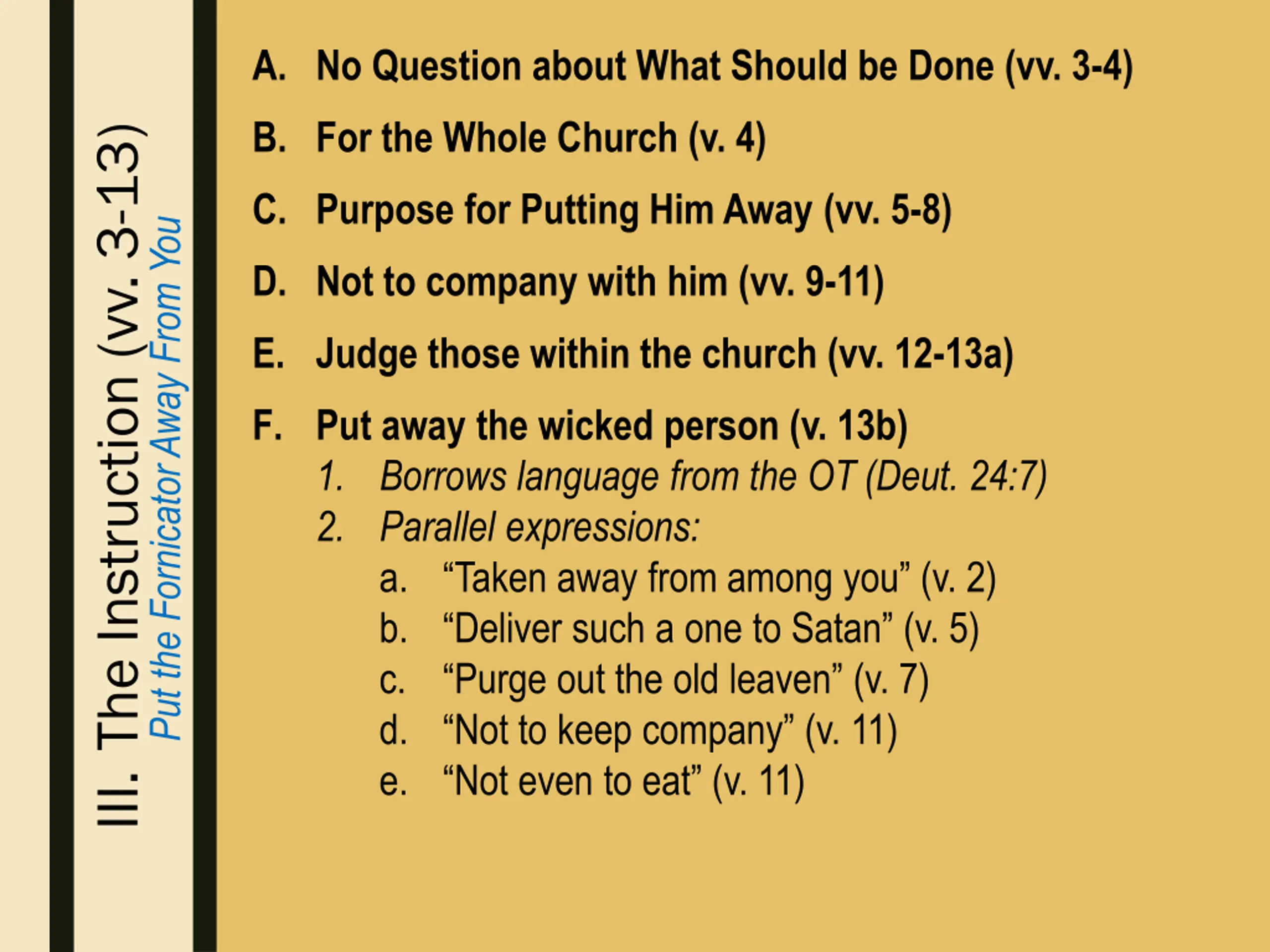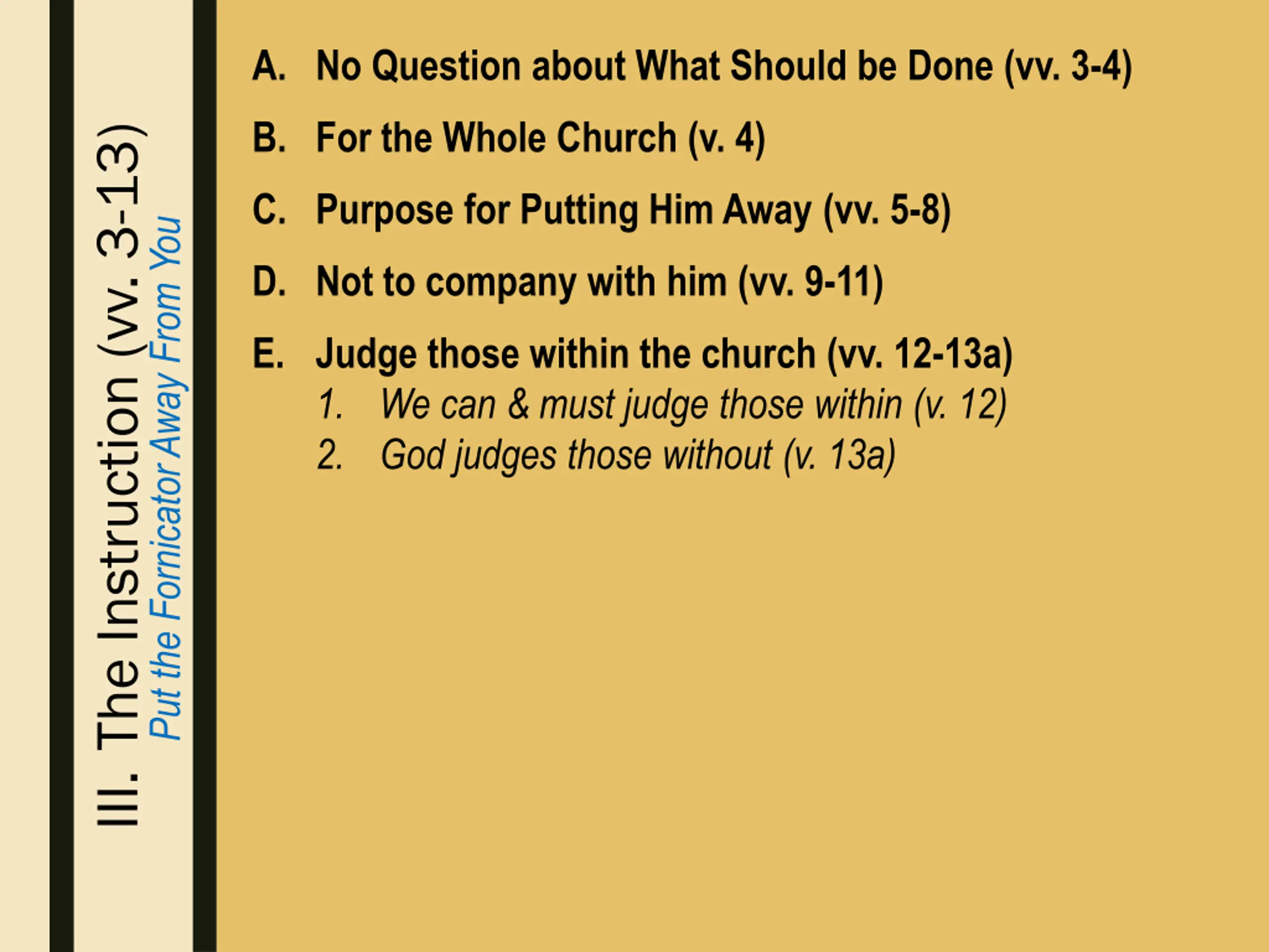 A. No Question about What Should be Done (vv. 3-4) B. For the Whole Church (v. 4) III. The Instruction (vv. 3-13) C. Purpose for Putting Him Away (vv. 5-8) Put the Fornicator Away From You D. Not to company with him (vv. 9-11) E. Judge those within the church (vv. 12-13a) 1. We can & must judge those within (v. 12) 2. God judges those without (v. 13a)