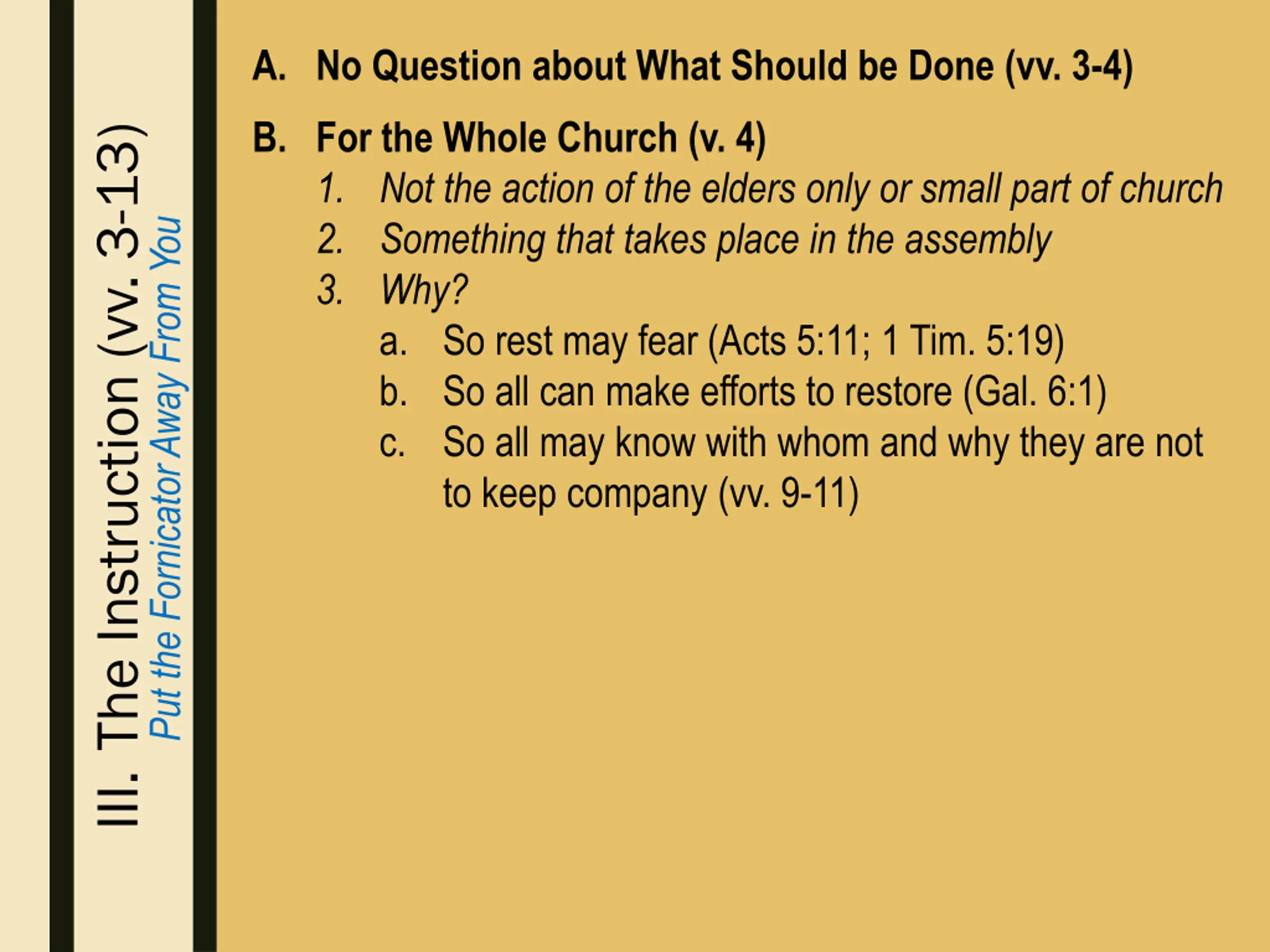 A. No Question about What Should be Done (vv. 3-4) B. For the Whole Church (v. 4) 1. Not the action of the elders only or small part of church 2. Something that takes place in the assembly 3. Why? a. So rest may fear (Acts 5:11; 1 Tim. 5:19) b. So all can make efforts to restore (Gal. 6:1) c. So all may know with whom and why they are not to keep company (vv. 9-11) III. The Instruction (vv. 3-13) Put the Fornicator Away From You