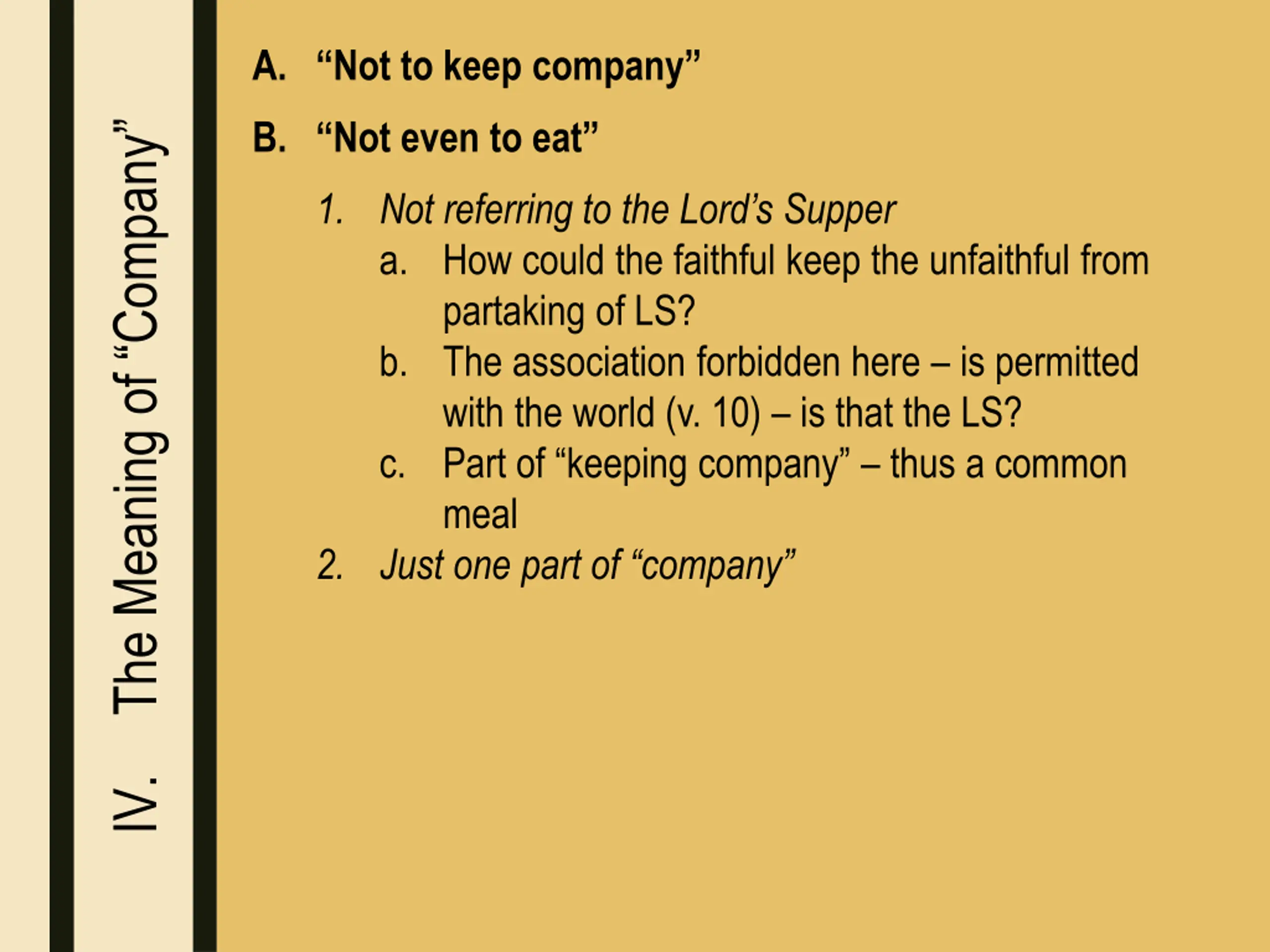 A. “Not to keep company” B. “Not even to eat” The Meaning of “Company” 1. Not referring to the Lord’s Supper a. How could the faithful keep the unfaithful from partaking of LS? b. The association forbidden here – is permitted with the world (v. 10) – is that the LS? c. Part of “keeping company” – thus a common meal 2. Just one part of “company” IV.